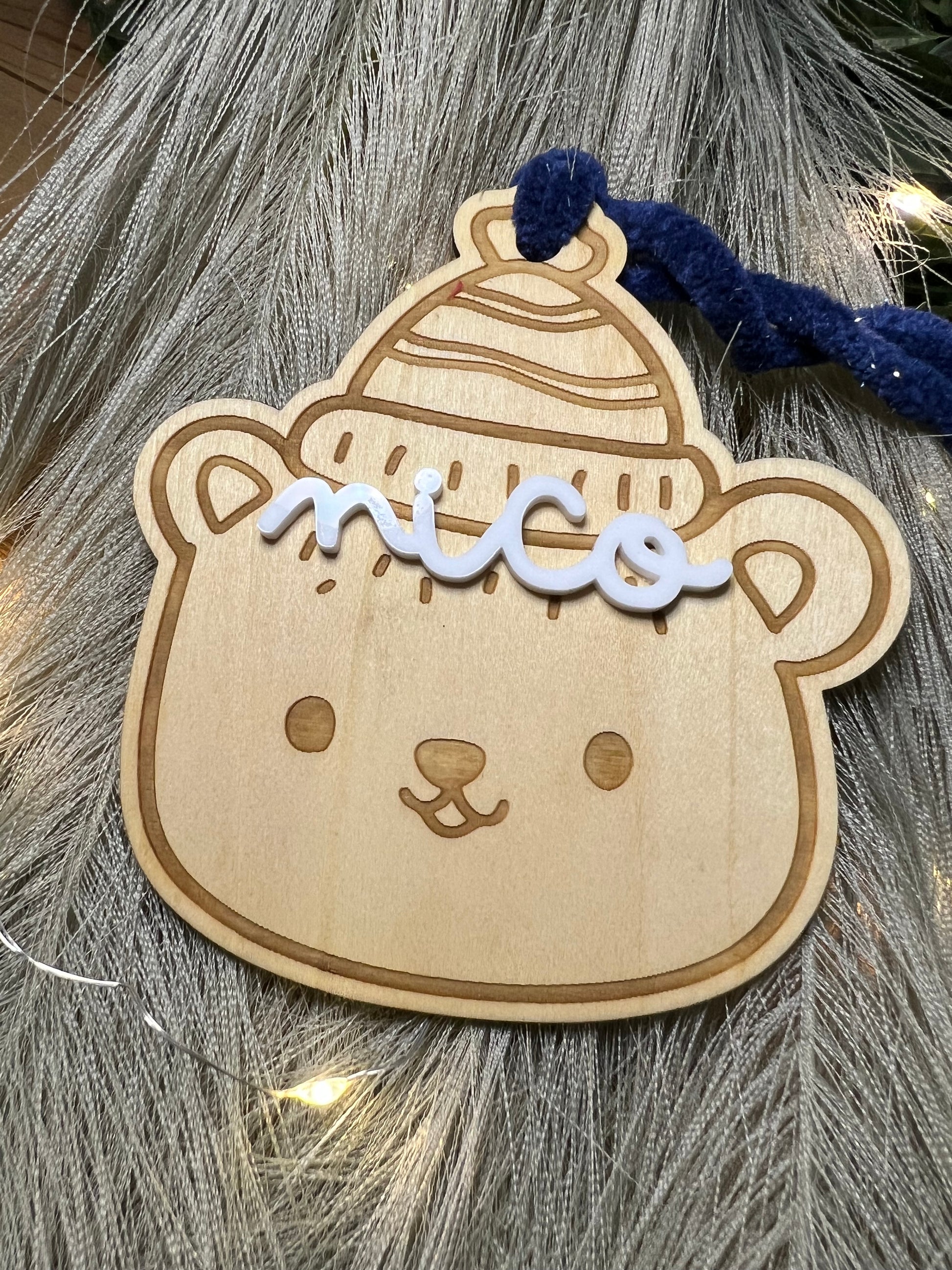 Adorno de madera con cabeza de osito. Mide unos 10 cm