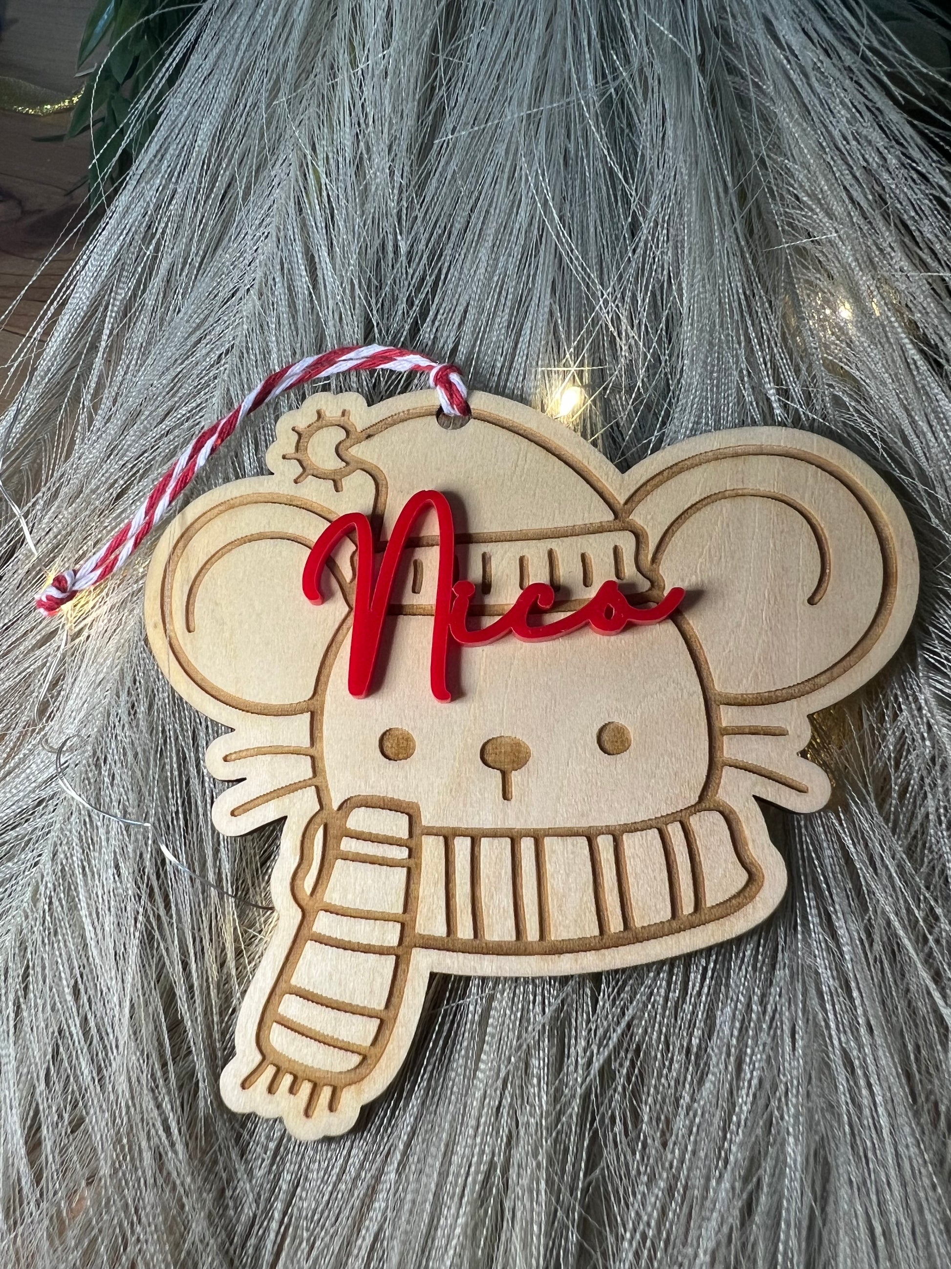 Adorno de madera con cabeza de ratoncito, mide unos 11 cm aproximadamente