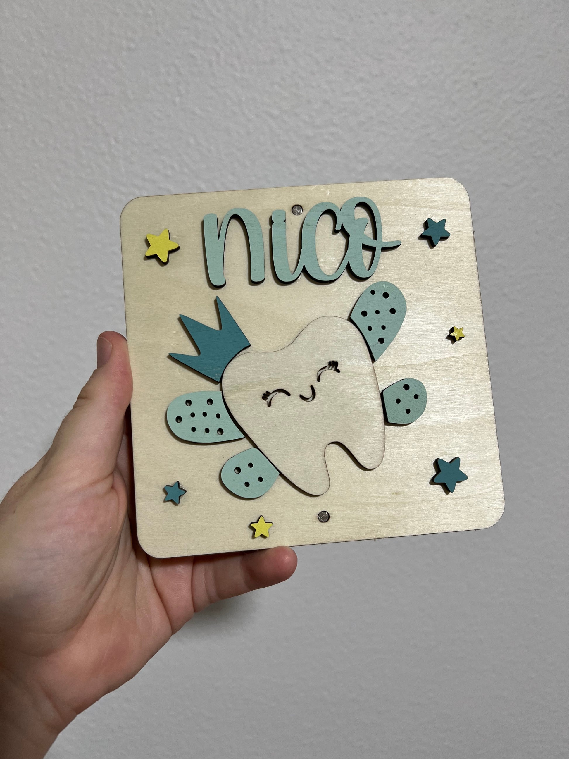 Caja para guardar los dientes personalizada. Tiene un hueco para cada diente y una línea para escribir la fecha en la que cae el diente. Se cierra con imán