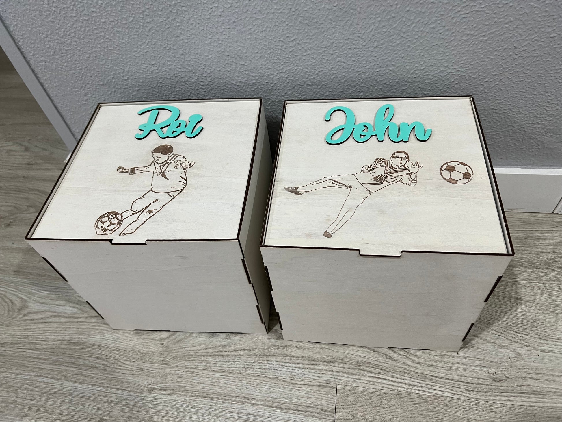 Caja en forma de cubo para regalar un balón, tamaño ideal para guardar después juguetes o recuerdos. Mide 26x26x26 cm. Personalizada con la imagen de la persona y nombre en color