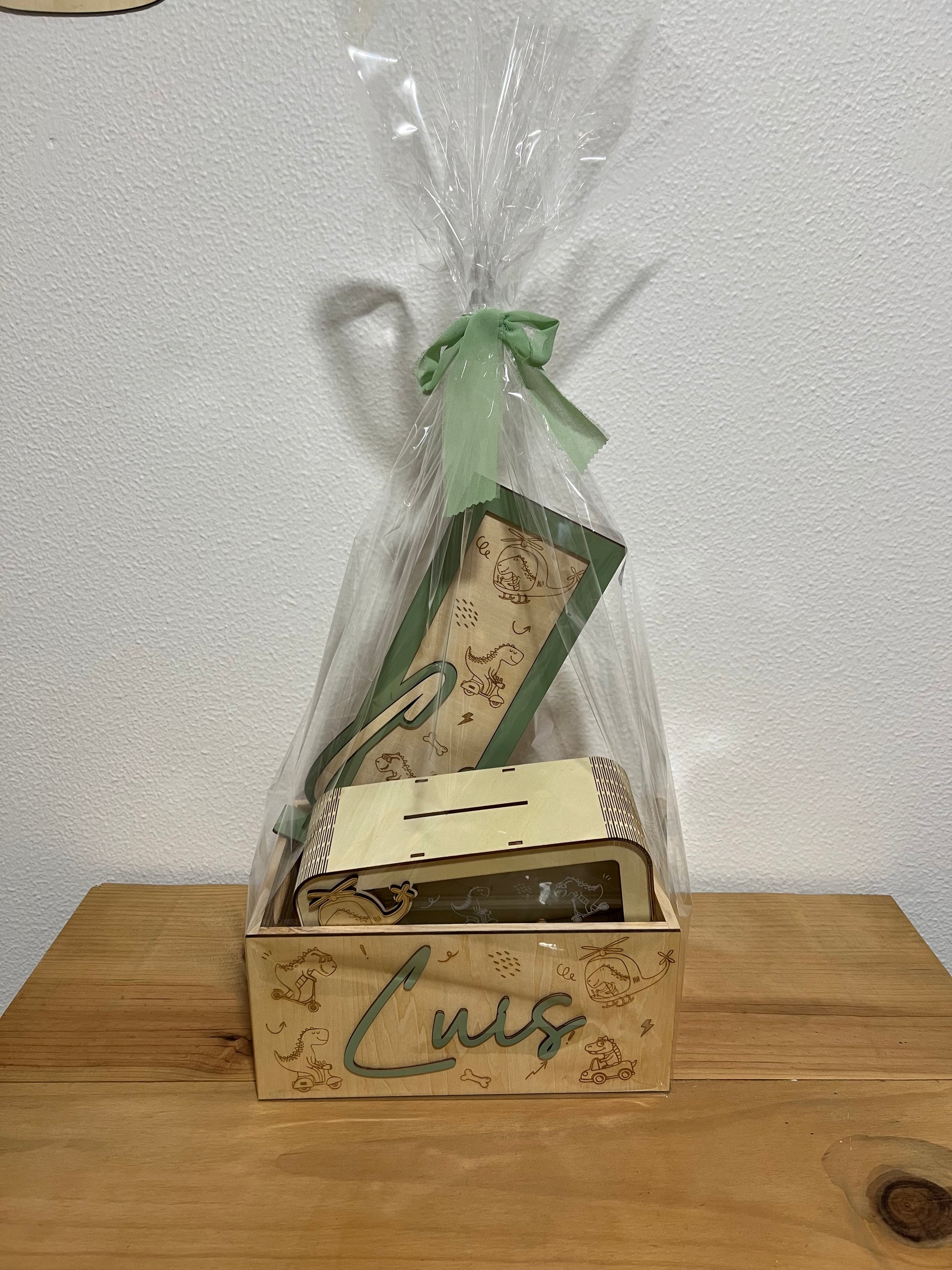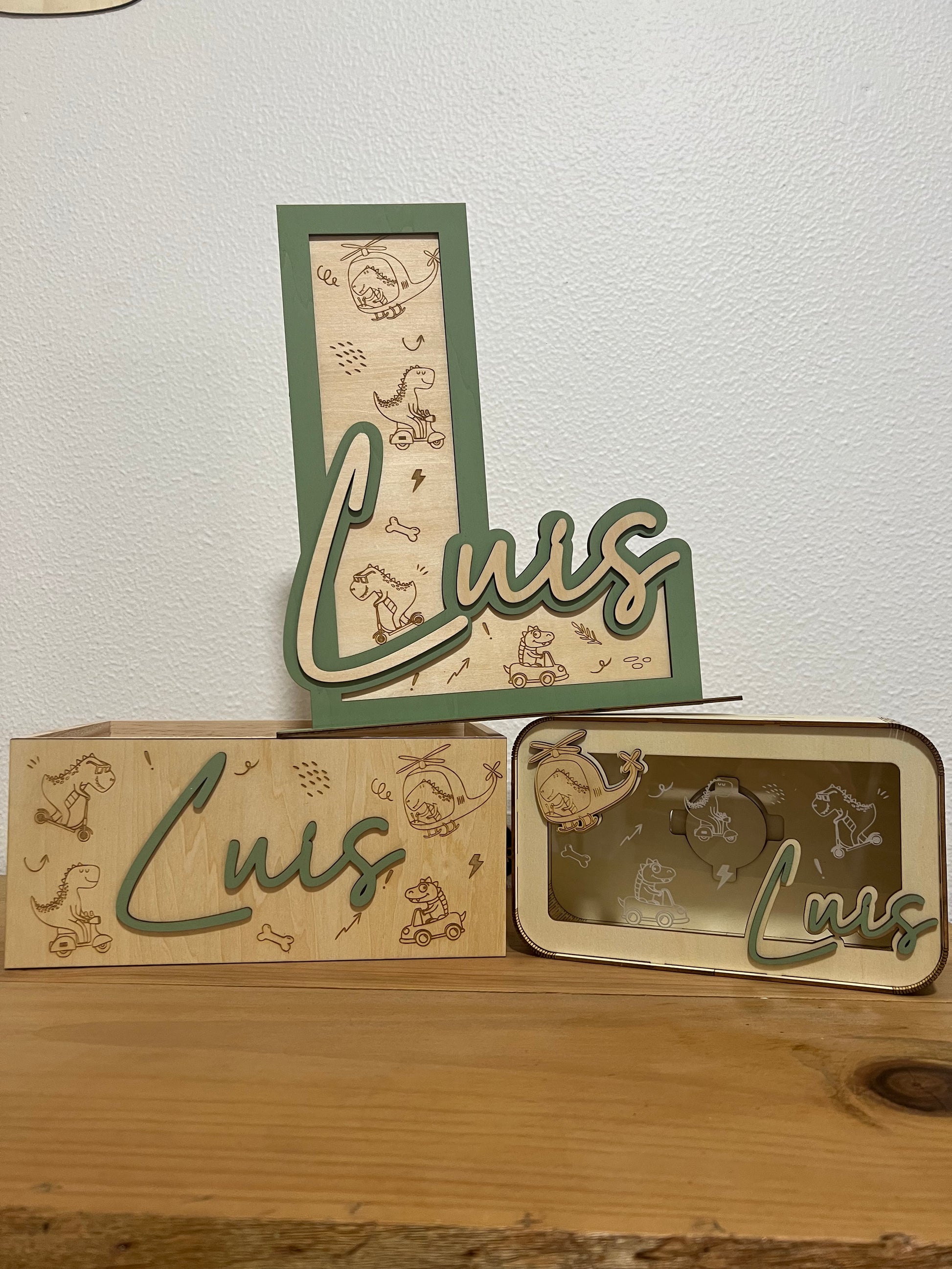 Caja de madera maciza de 30x20x13,5 cm, con madera grabada con dinosaurios y nombre en relieve.