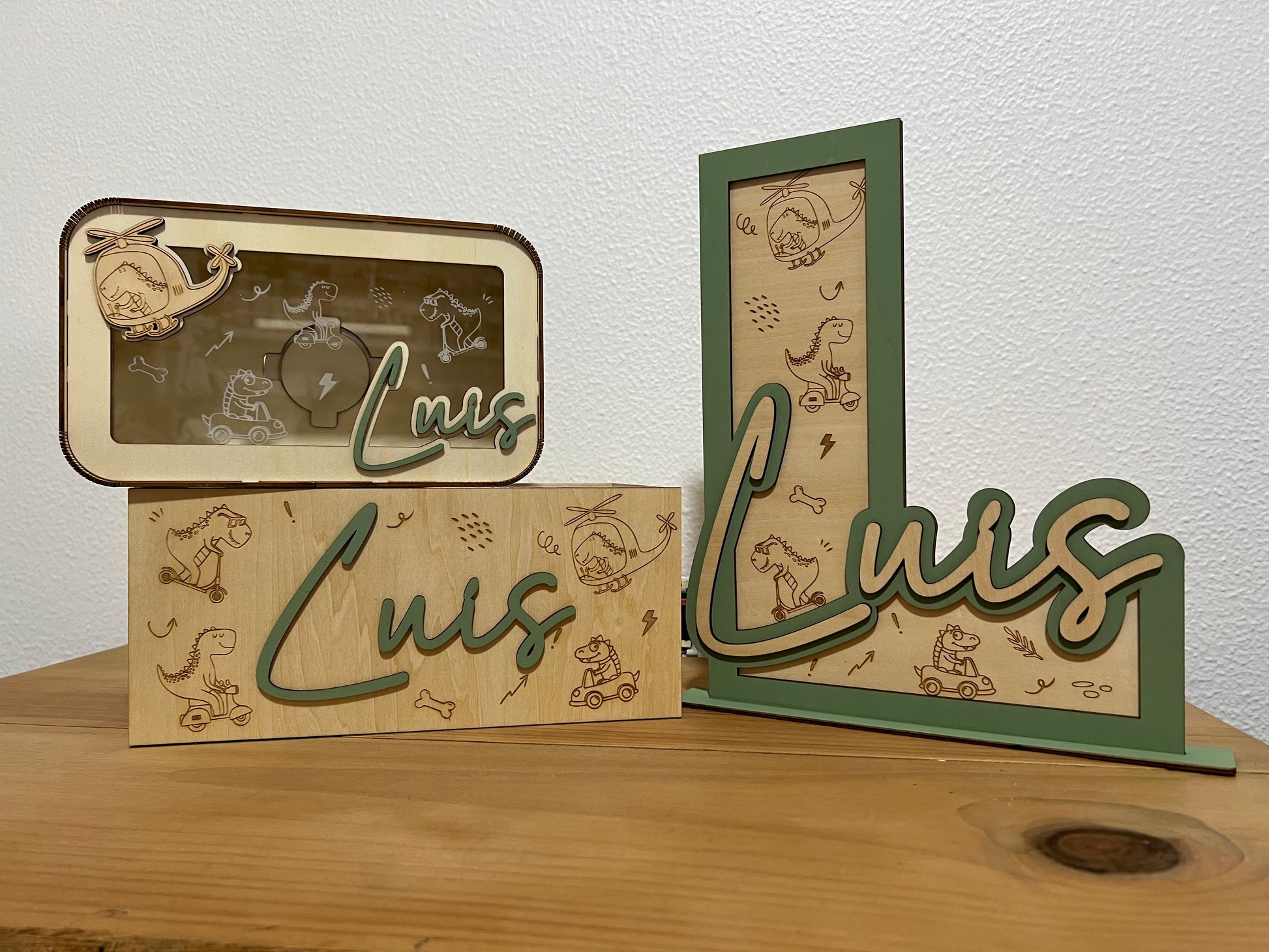 Inicial con nombre de 38x28 cm, con grabado de dinosaurios y nombre en relieve de madera