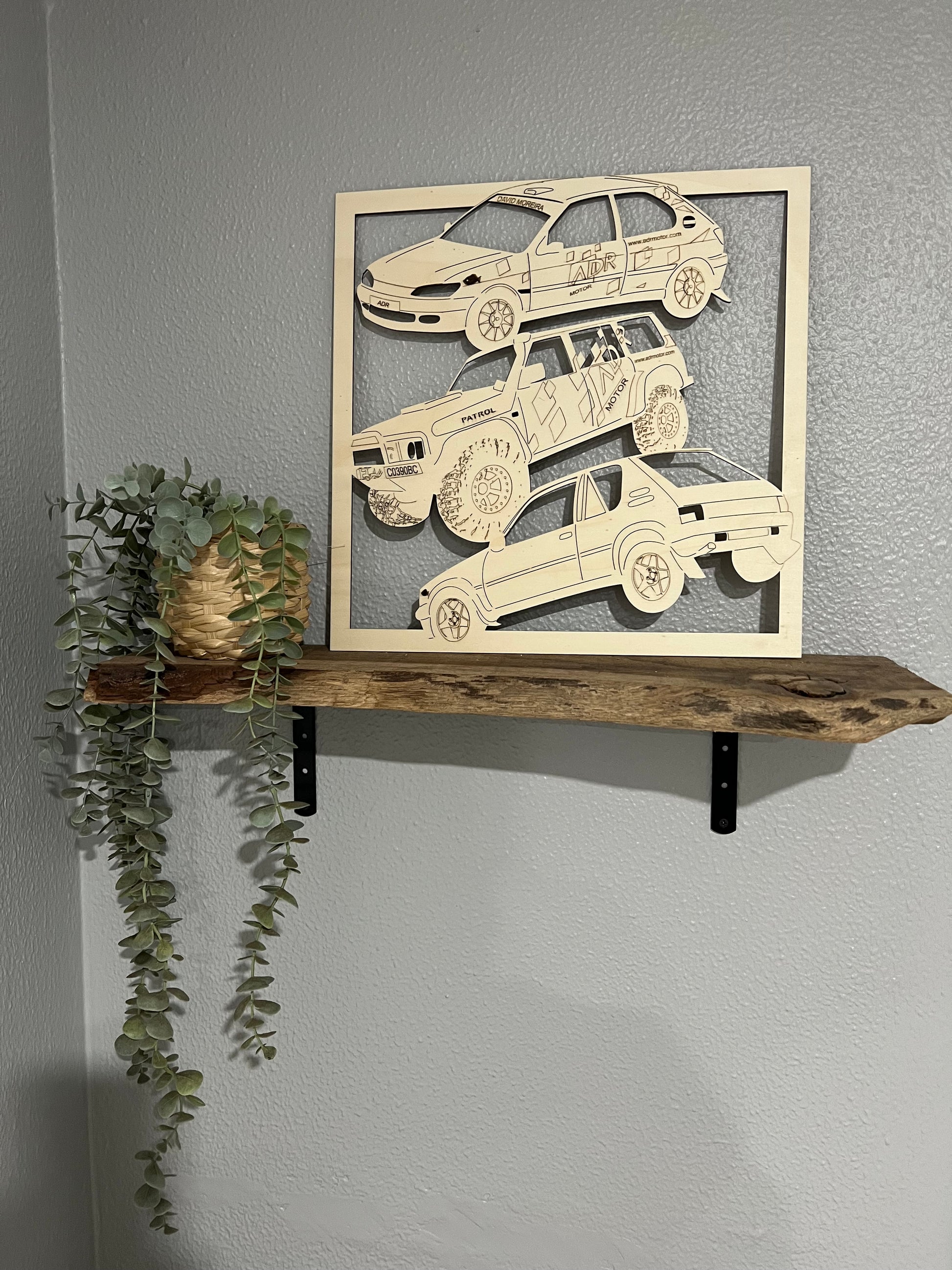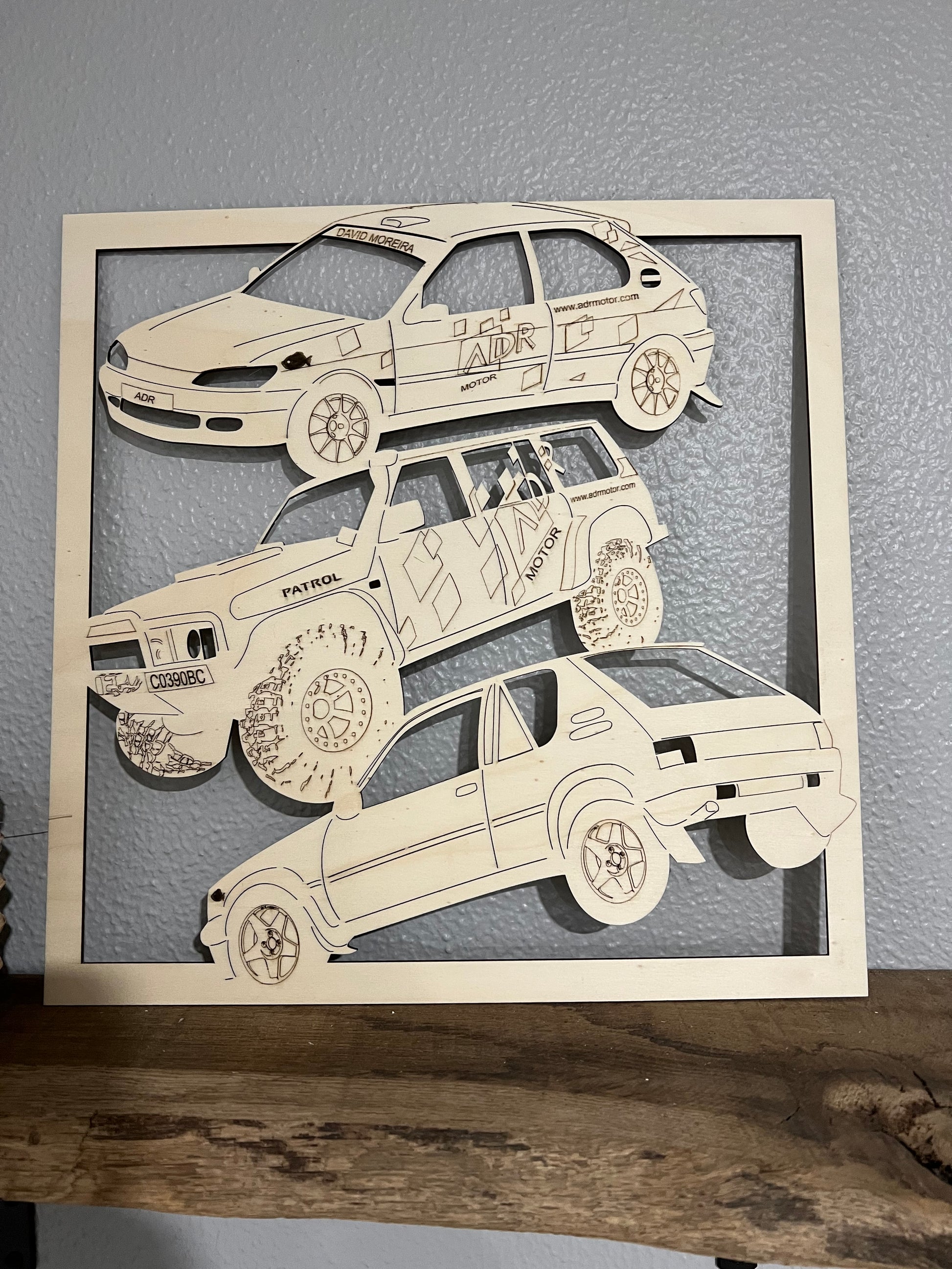 Cuadro formado por el dibujo de 3 coches, dibujados sobre las fotos de tus propios coches. Mide 40x40 cm. Puede combinarse coches, motos, quads, todoterreno...