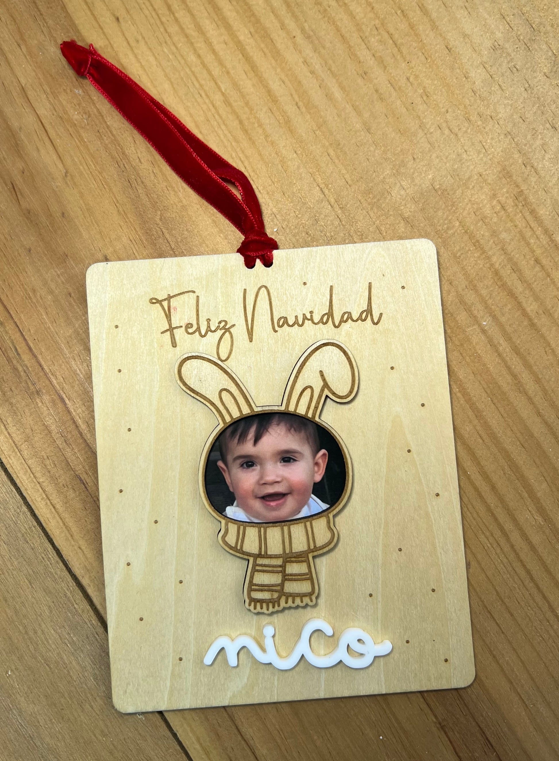 Felicitación con foto dentro de un conejito con bufanda , se entrega con la foto puesta. Escribe el nombre y la frase que desees poner arriba.