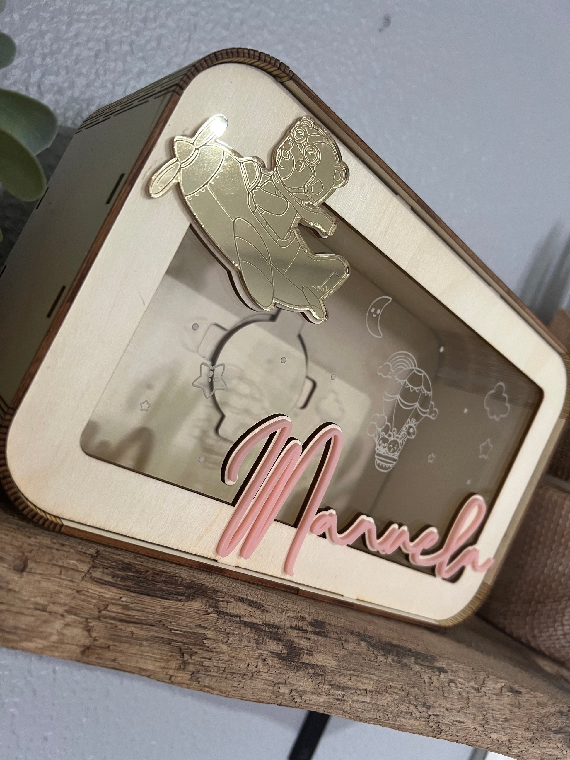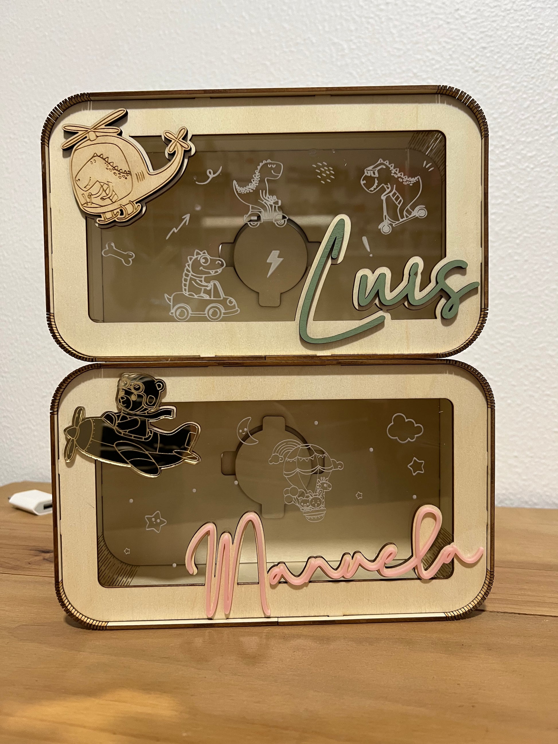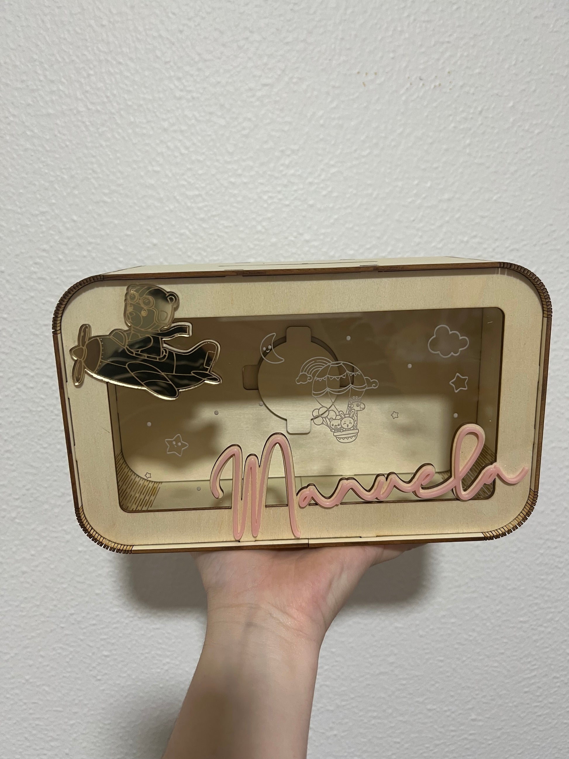 Hucha de 25 cm de ancho x 15 cm de alto, hecha con madera y metacrilato de 3 mm de espesor. Con cierre giratorio en la parte posterior.