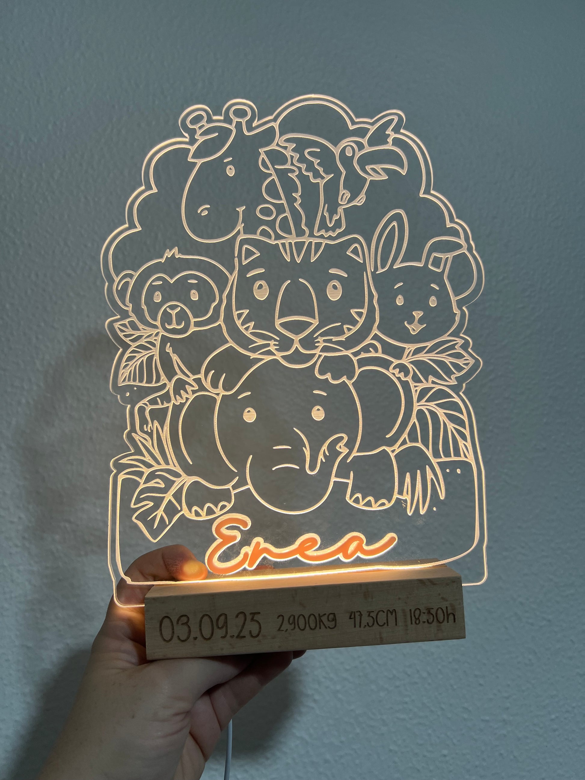 Lámpara realizada en metacrilato de 4 mm de espesor, con grabado de animalitos. Medidas: 28,5 de alto x 20 cm de ancho.