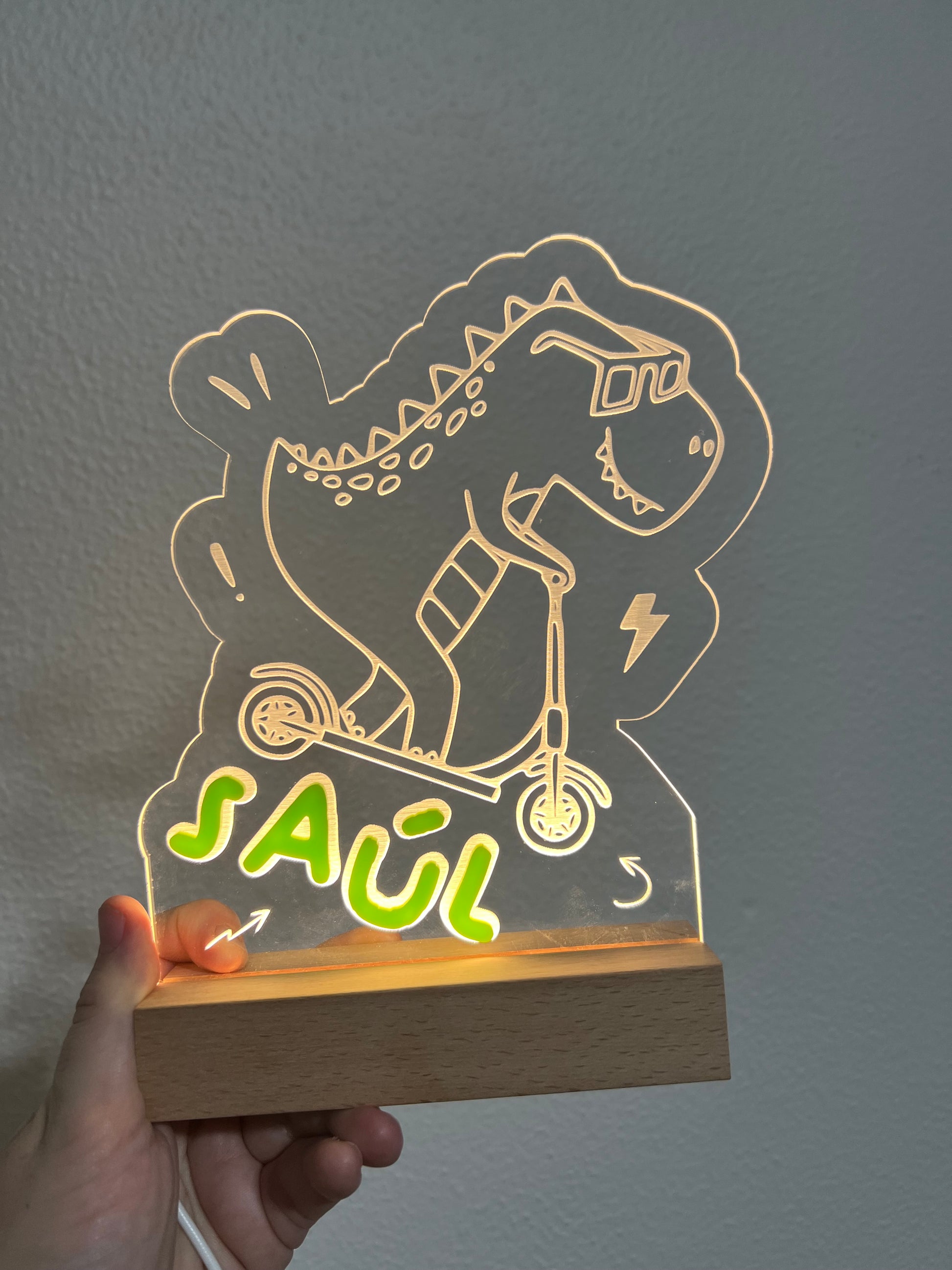 Lámpara de metacrilato de 4 mm de espesor, con dibujo de dinosaurio y nombre.