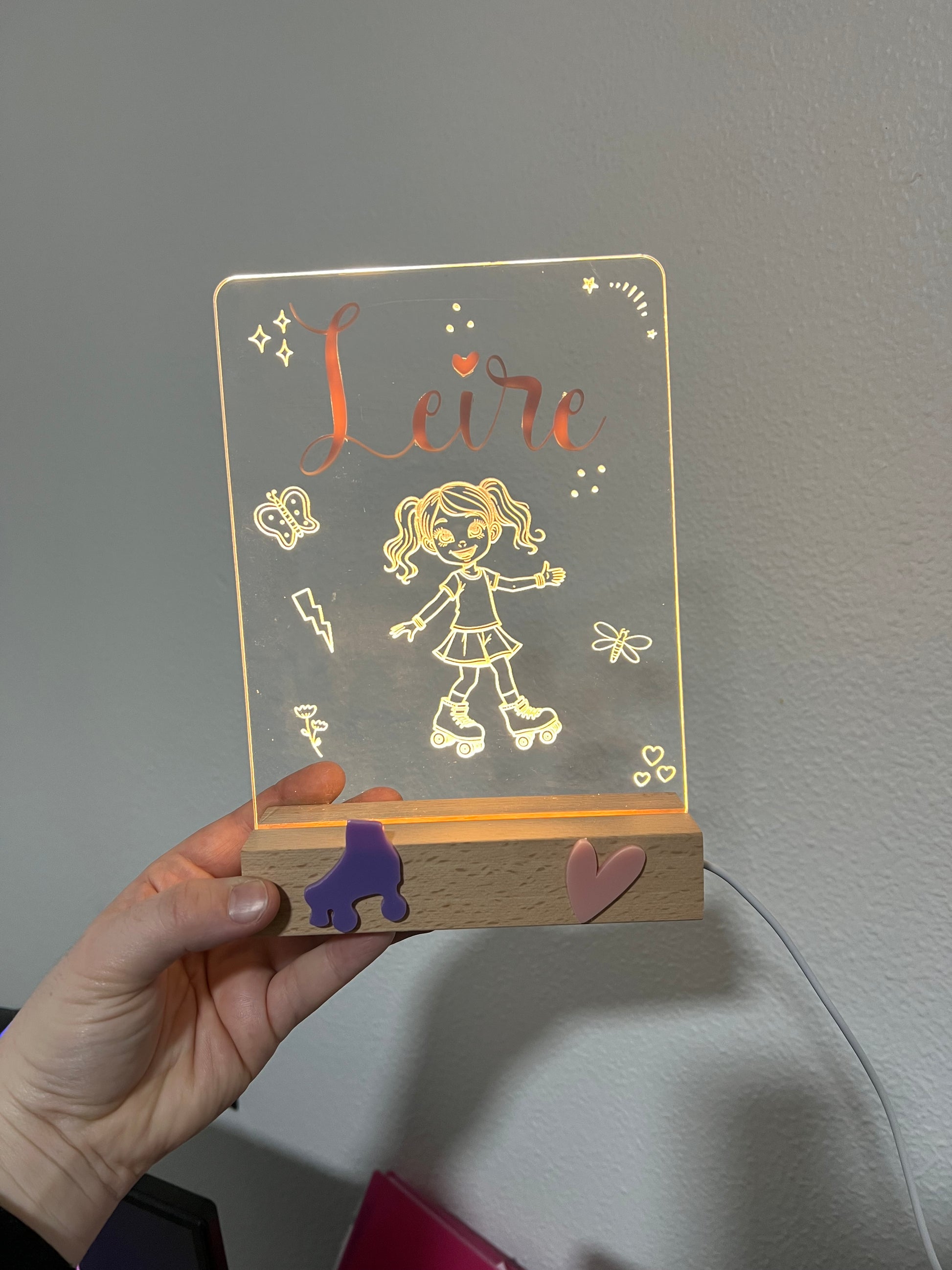 Lámpara de metacrilato con dibujo de partinaje y nombre en metacrilato de color. Mide 15 cm de ancho y 23 cm de alto.