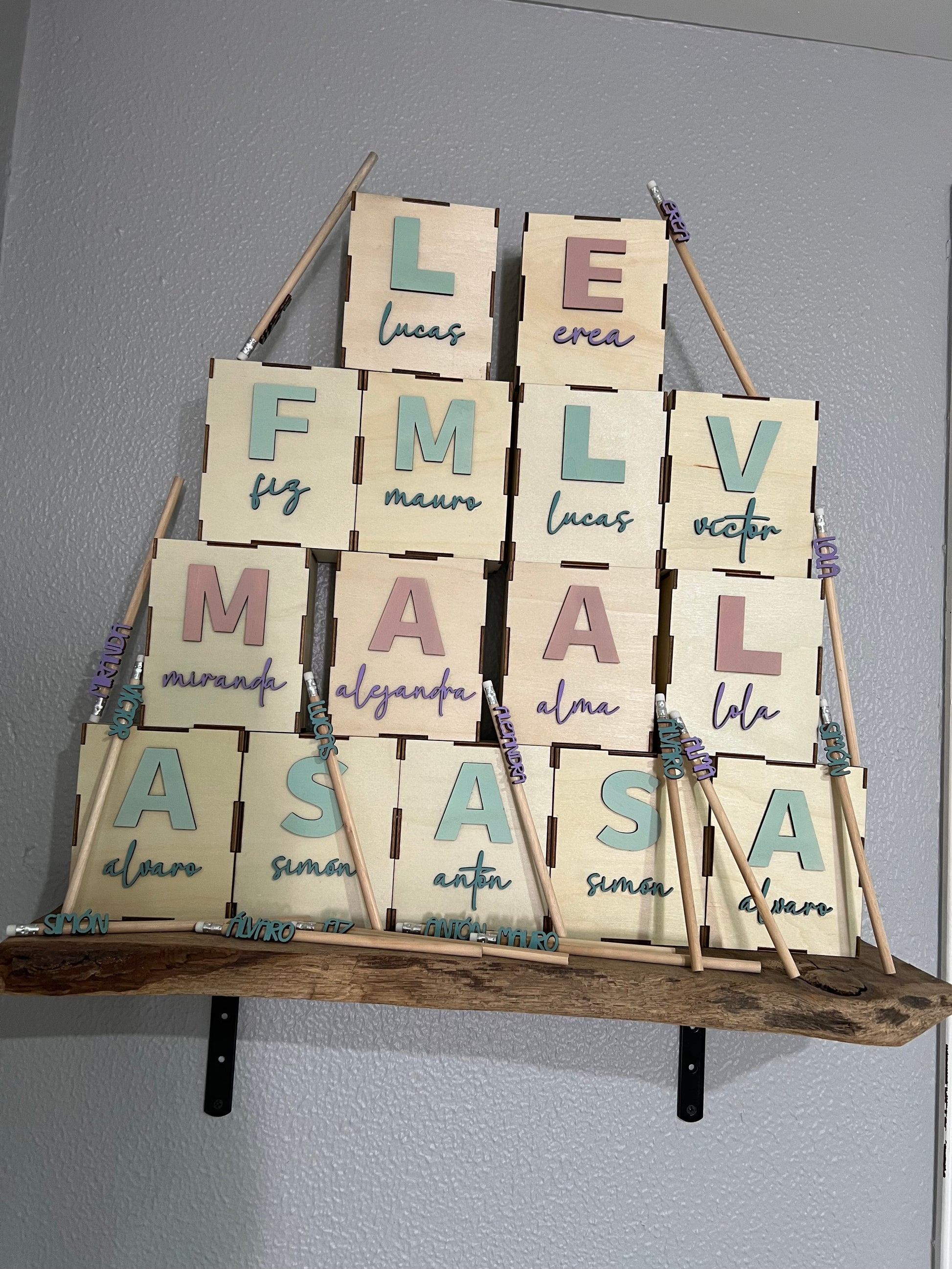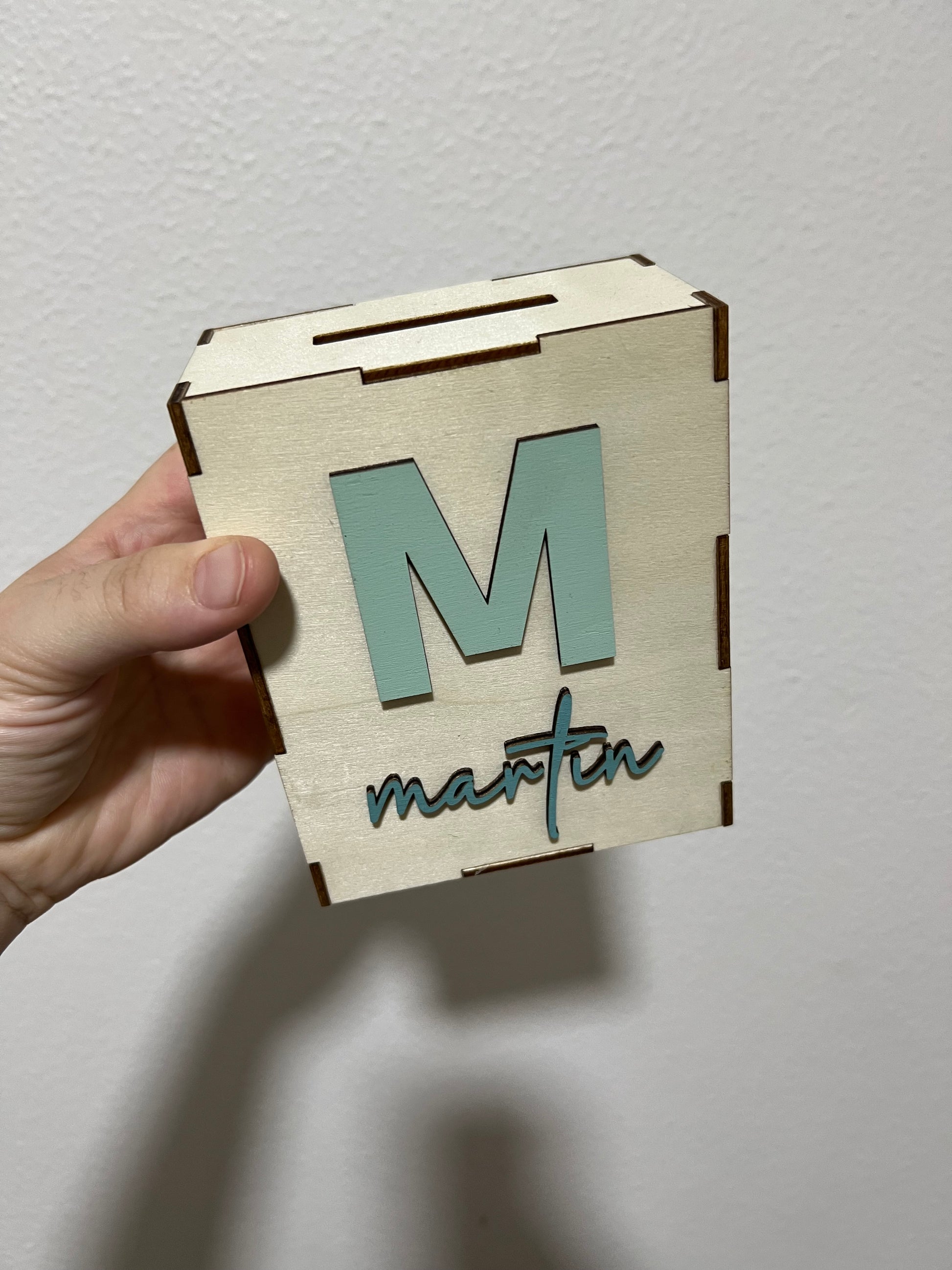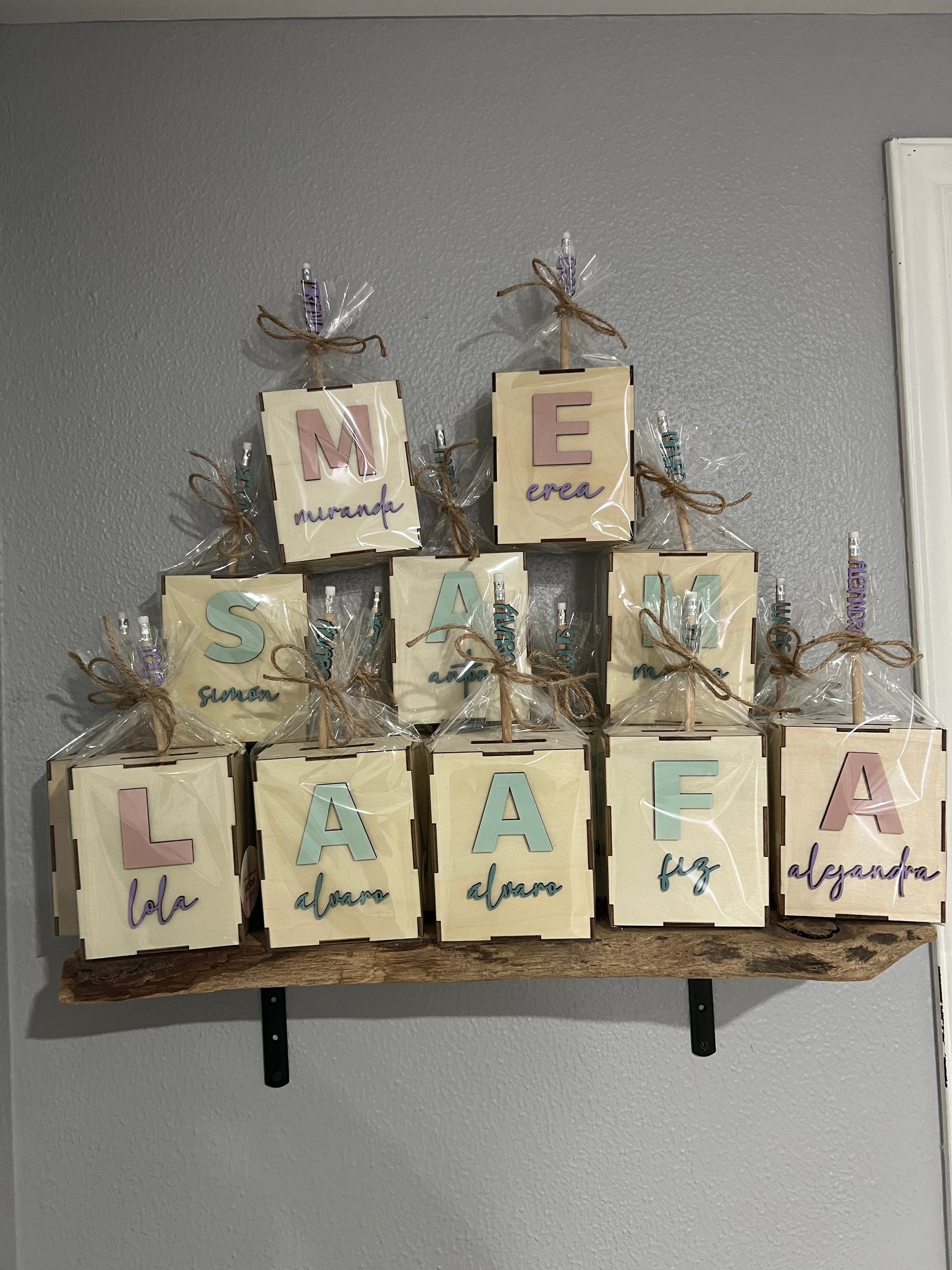 Pack para eventos compuesto por hucha de madera con cierre giratorio por la parte trasera. Con inicial y nombre en dos tonos diferentes