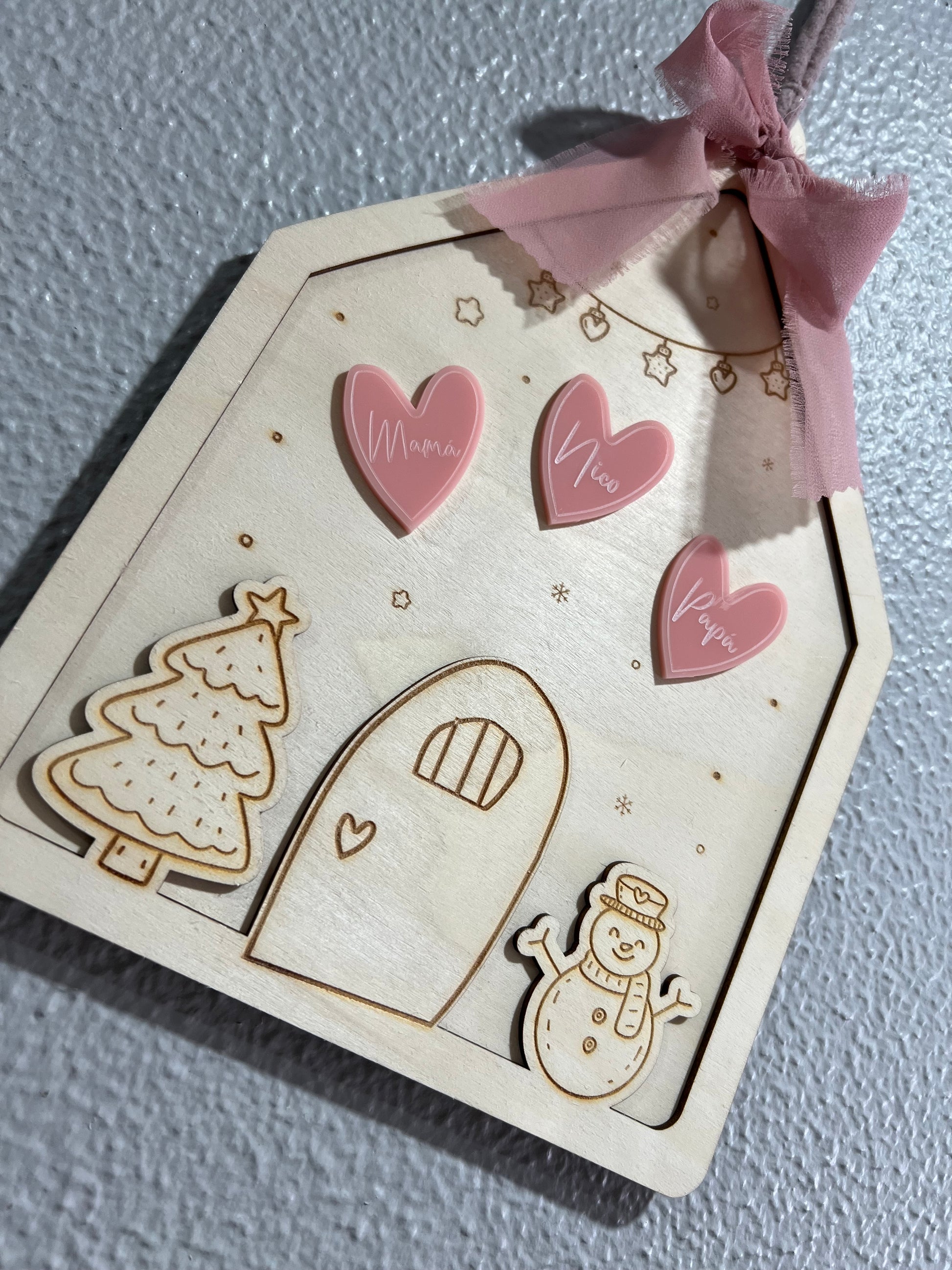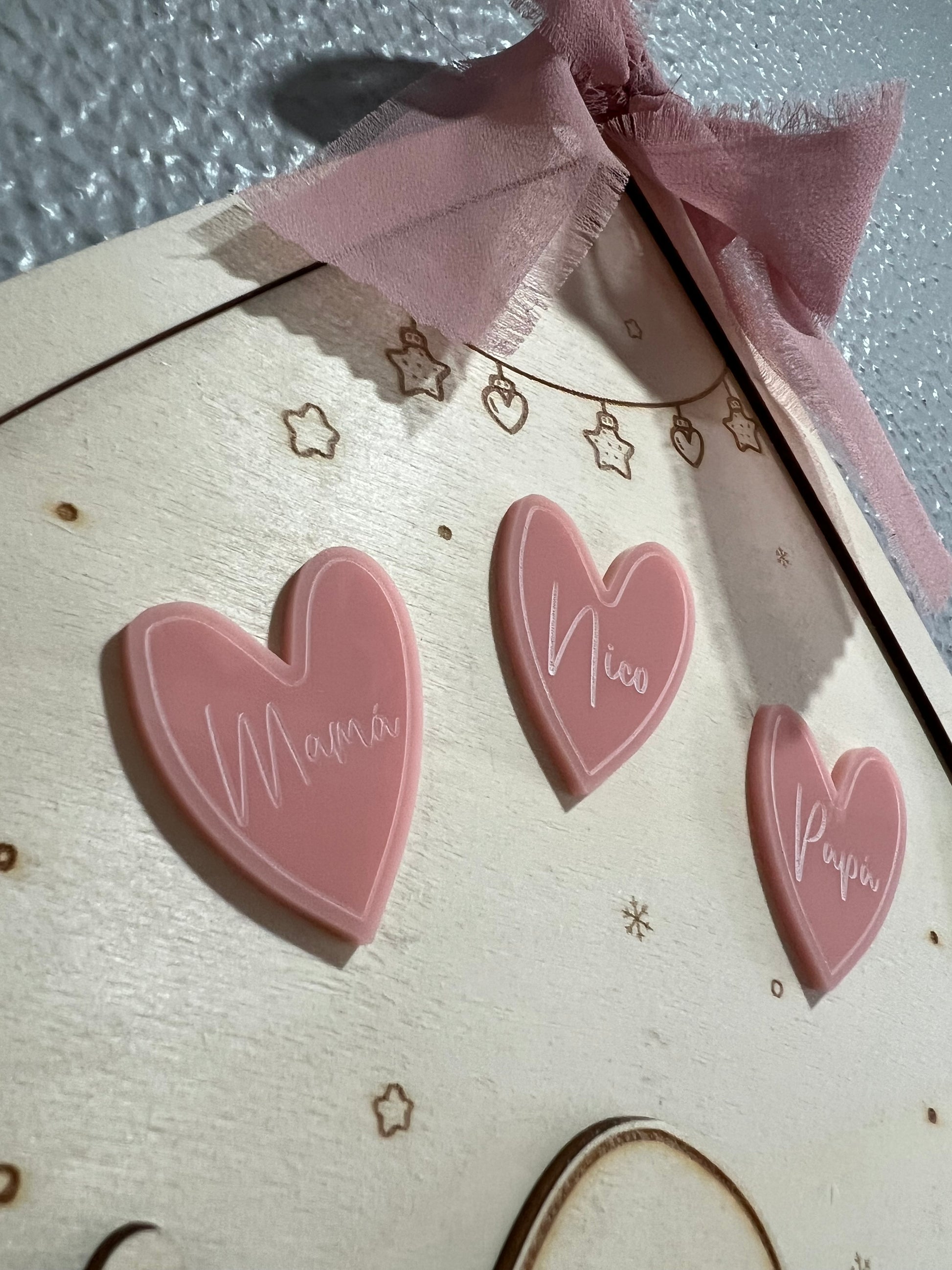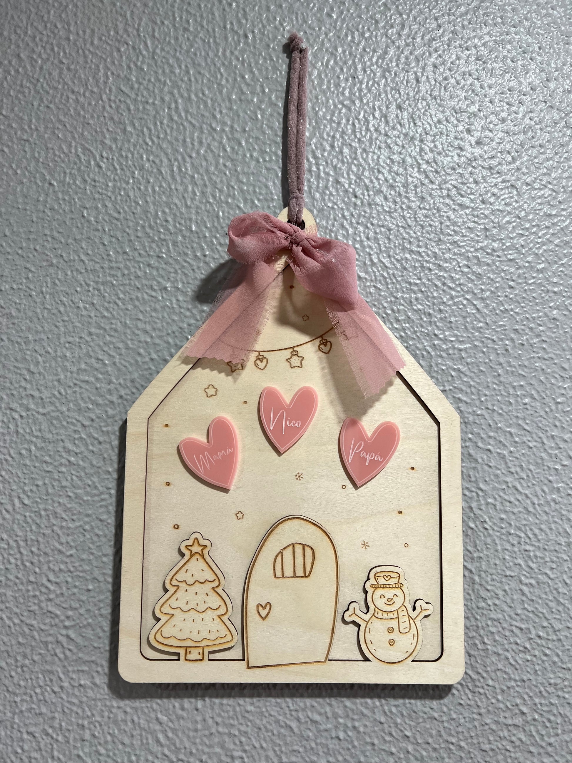 Adorno para colgar en forma de casa. Lleva los nombres de toda la familia en corazoncitos de metacrilato (puedes elegir el color que quieras). Los corazones también pueden ser de madera. El lazo y cordón se pondrá a conjunto con los corazones