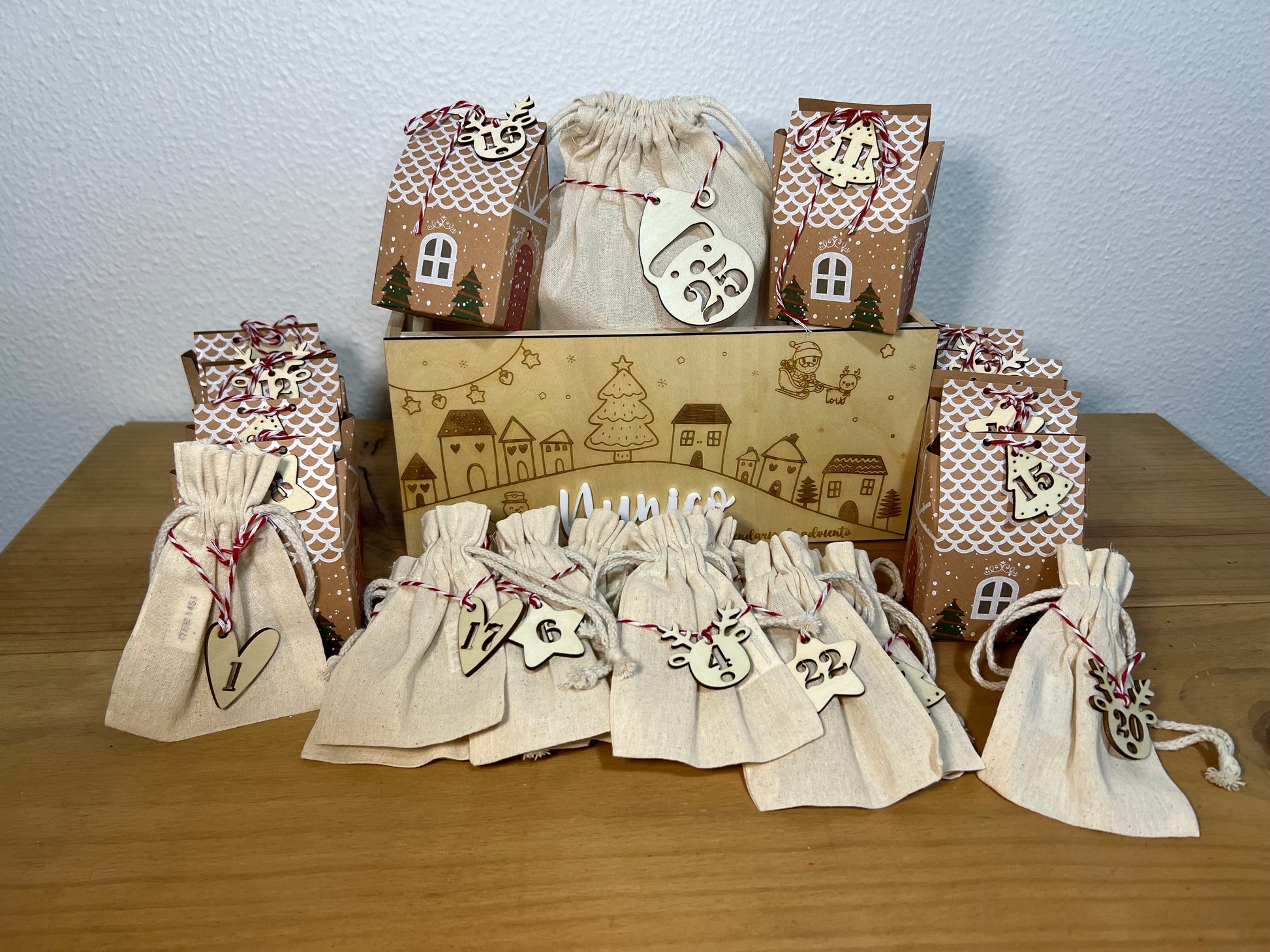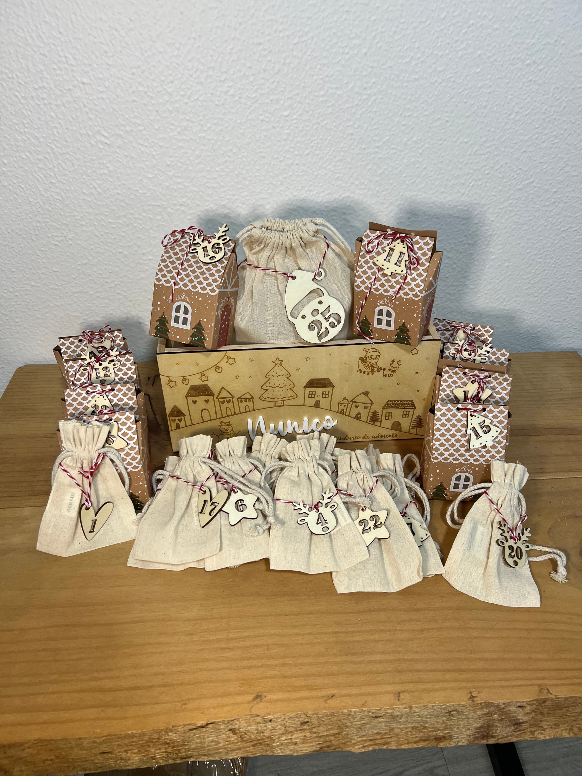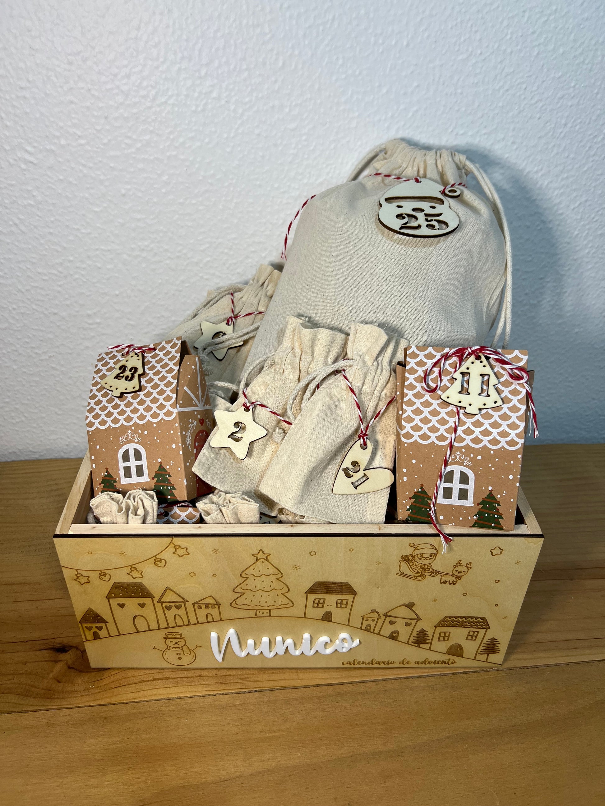 Caja de madera maciza de 30x20x14 cm , bolsa grande para el día 25, 14 bolsitas pequeñas y 10 casitas de cartón, enumeradas ambas con medallitas con el número de cada día. El nombre puede ir en metacrilato o madera del color que elijas.