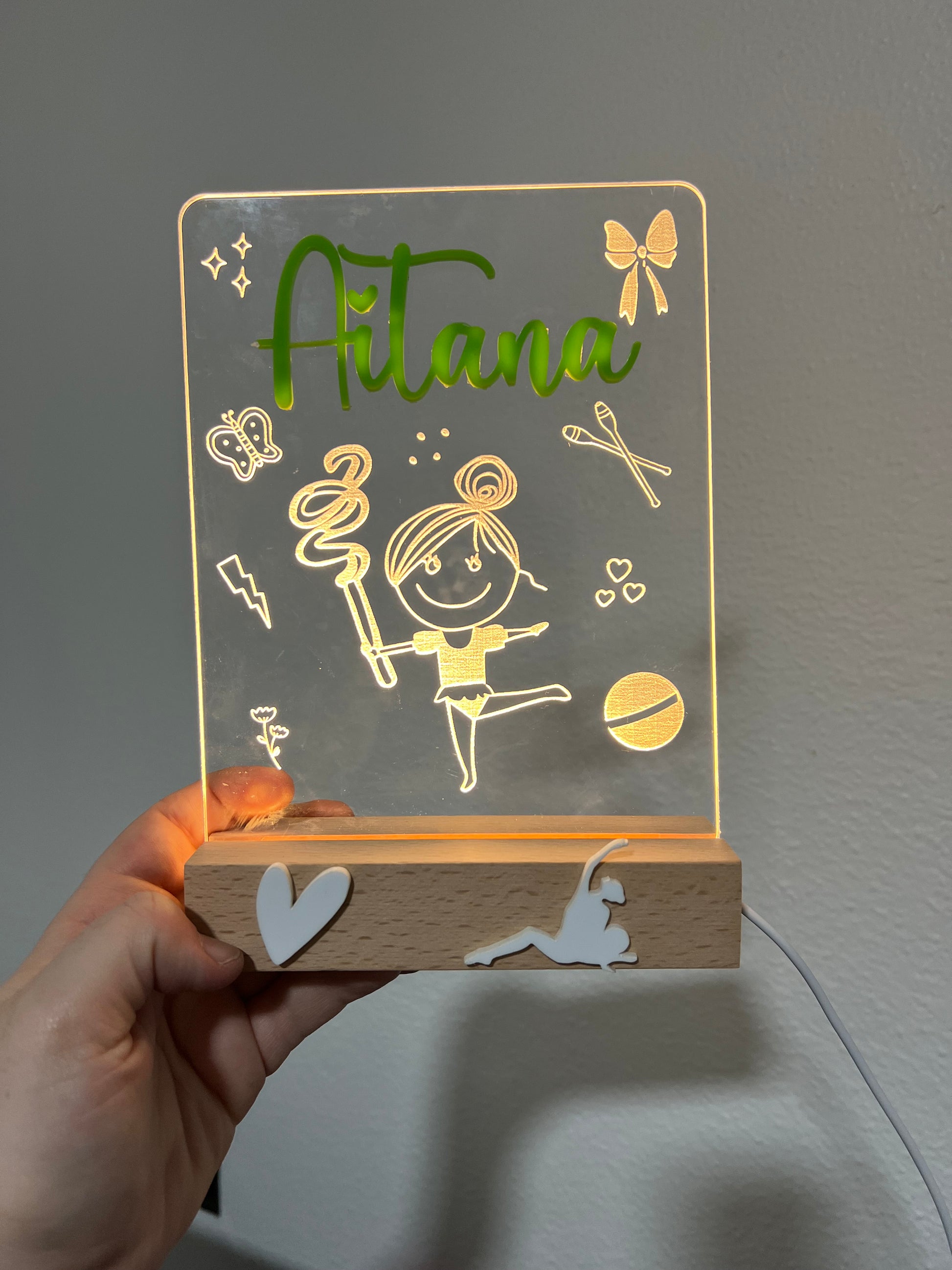 Lámpara de metacrilato con dibujos de gimnasia rítmica y nombre en metacrilato de color. Mide 15 cm de ancho x 23 cm de alto