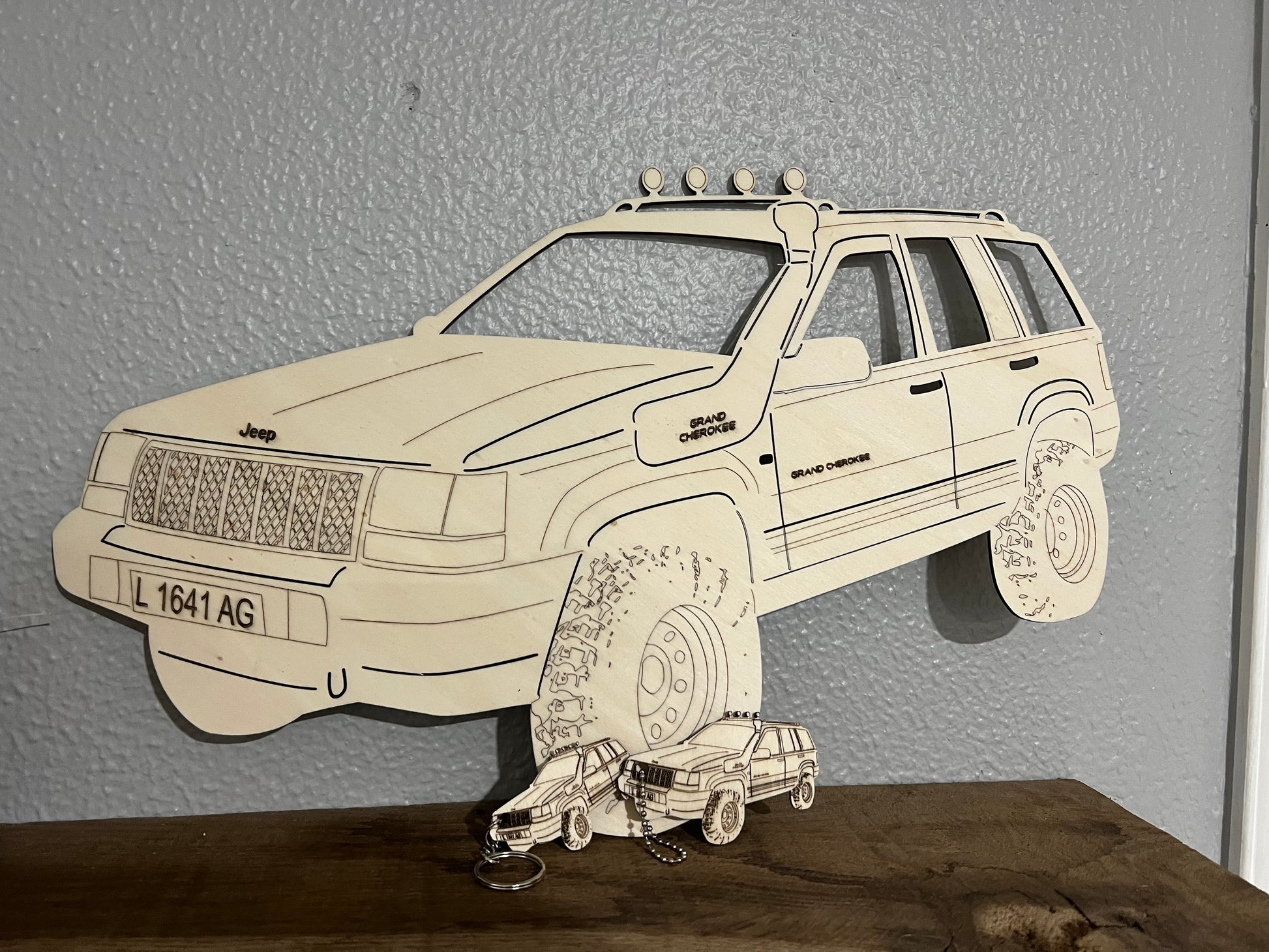 Todoterreno de madera para colgar en pared. Mide aproximadamente 50 cm de ancho. Está dibujado a partir de la foto de tu propio coche.